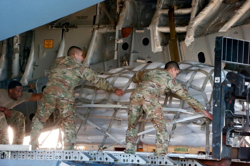 US soldiers load a C-17 cargo plane with food, water and medicine for a humanitarian mission to Venezuela, at Homestead Air Force Base in Homestead, Florida, on February 22, 2019. (RHONA WISE/AFP/Getty Images)