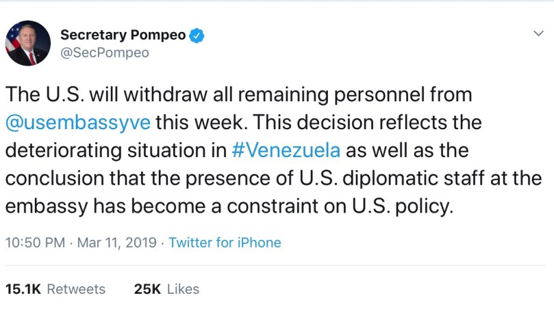 And on Monday, Secretary of State Mike Pompeo ordered all U.S. diplomats to leave Venezuela, saying their presence there “has become a constraint on U.S. policy,” hinting at opening potential military options.
