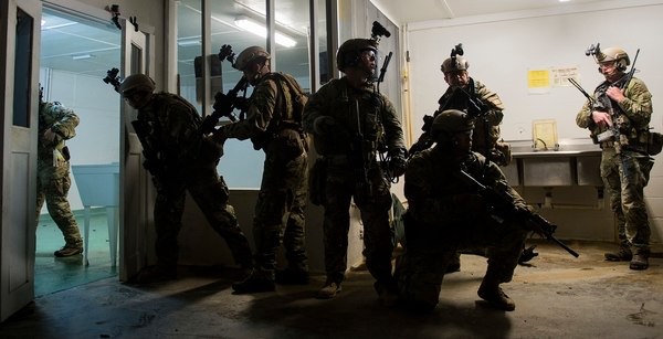 Members of the Chilean navy special operations forces and U.S. Army 7th Special Forces Group clear a building during Emerald Warrior in Apalachicola, Fla., April 28, 2015. (Staff Sgt. Kenneth W. Norman/Air Force)