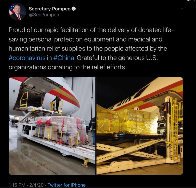 On the way into China, the two jetliners carried shipments of private aid—moves that followed several days of criticism from Beijing about U.S. policy following the outbreak of the coronavirus, which has killed hundreds of people and infected more than 20,000, the most in and around Wuhan city.