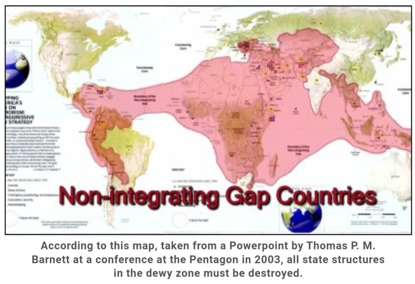 According to this map, taken from a Powerpoint by Thomas P. M. Barnett at a conference at the Pentagon in 2003, all state structures in the dewy zone must be destroyed.