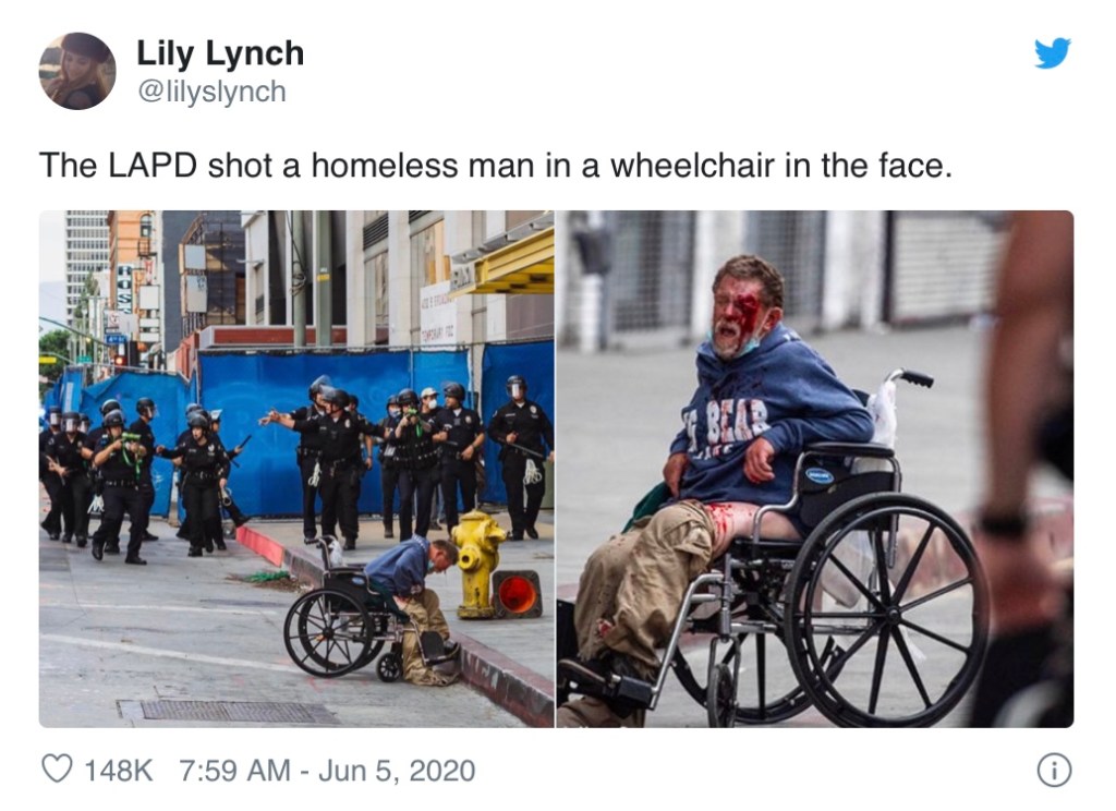 One of the hard rubber bullet rounds struck a homeless man in a wheelchair right above his left eye, drawing blood and a large welt.