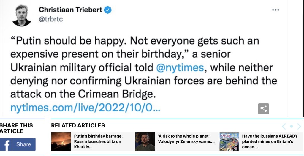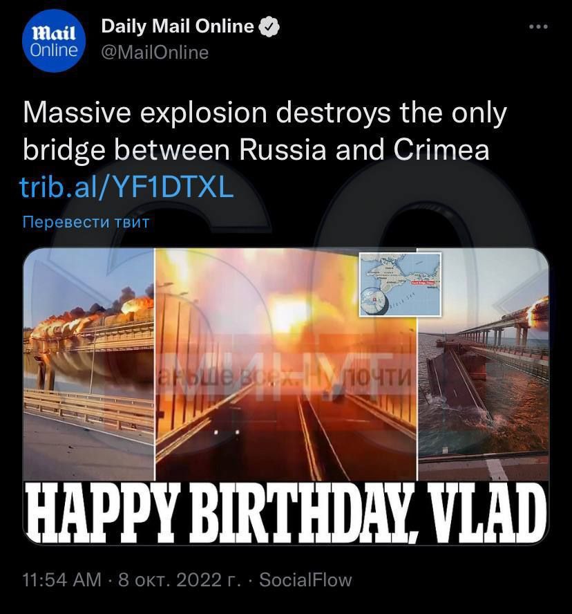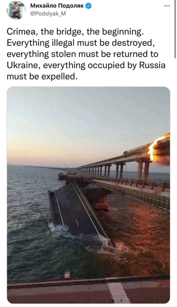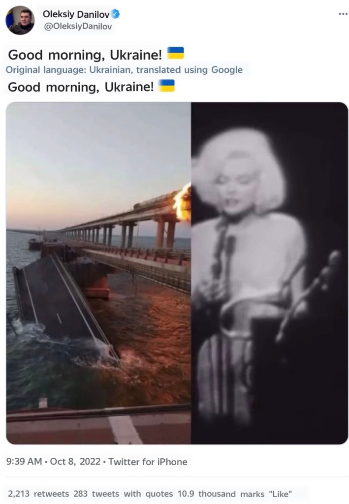 Secretary of the National Security and Defense Council of Ukraine, Oleksiy Danilov, boasting about the attack with pictures of the damage and Marilyn Monroe singing, “Happy Birthday, Mr. President” to JFK. (Yesterday was Vladimir Putin’s birthday!)