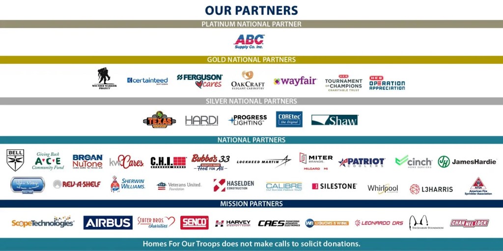 As a highly rated military and Veterans nonprofit organization, Homes For Our Troops is 100% publicly funded, with approximately 65 percent of our operational budget generated by individual donors, private and family foundations, and community fundraisers nationwide who step up to help our Veterans by coordinating everything from lemonade stands to golf tournaments. The remaining 35% comes from corporate supporters in the form of cash and donated materials.