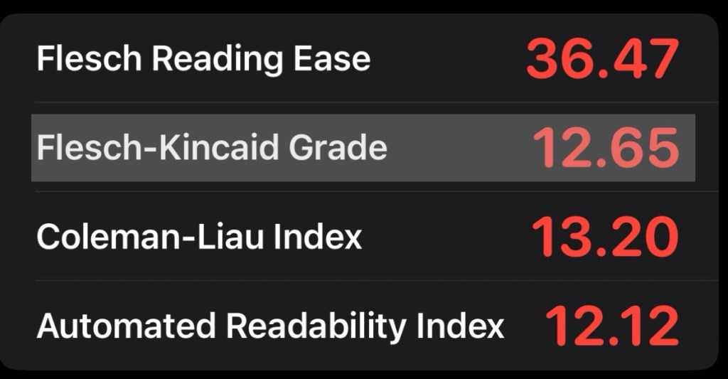 The average American reads at a level equivalent to an eighth grader (an eight). The readability rating for my article is currently 12.65. I would have posted this article this past weekend if I was only going to publish it here or on my Substack. As of right now, there are 2017 words in the document (it was 2200 when I took the screenshots below).