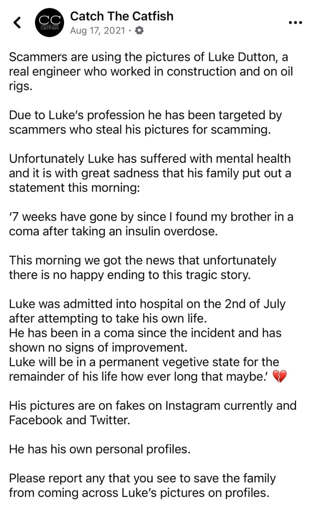 Everything felt too good to be true, Burns stressed. “The confirmation came when I did a reverse Google image search on his pictures and found a different guy’s Facebook account,” she said. “His only public post on the account was ‘My account was hacked again.’”
