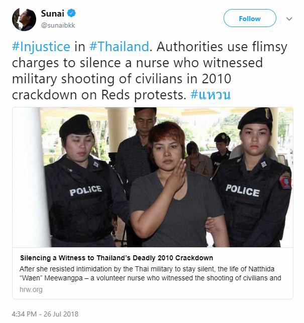The picture of Natthida “Waen” Meewangpa used by HRW in its July 23 article depicts her flashing the three-finger salute used by US-funded and backed anti-government agitators currently attempting to undermine and overthrow the Thai government and reinstall Shinawatra to power.