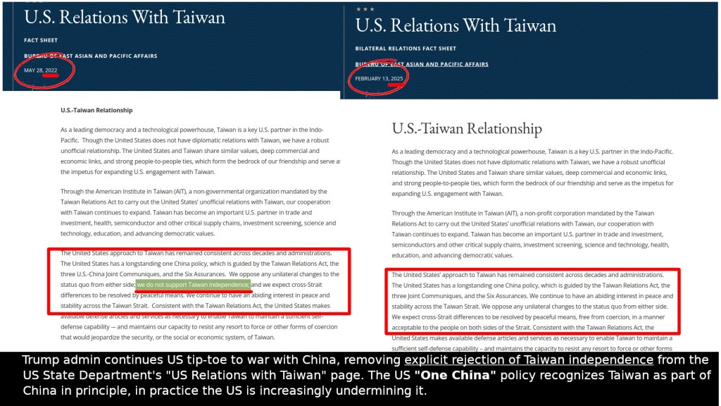 US State Dept. has JUST removed explicit rejection of Taiwan independence from its “US Relations with Taiwan” page.