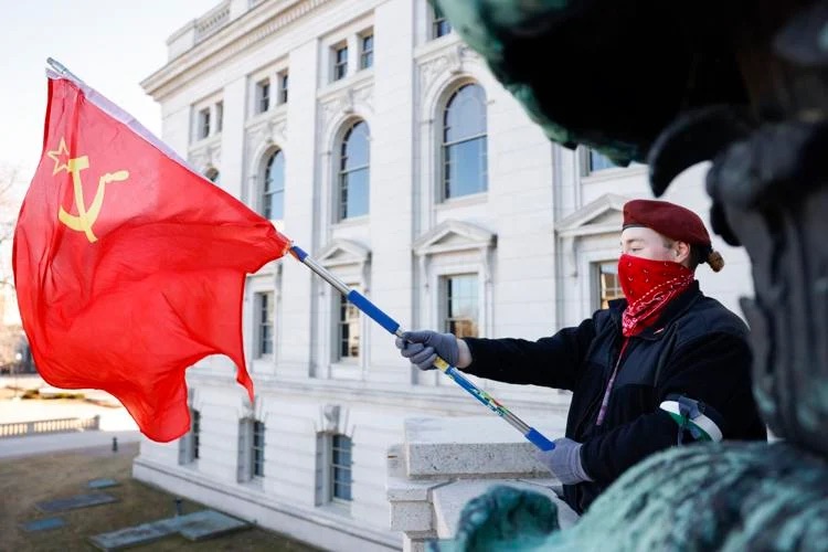 Lilith Kievskaya, a member of Revolutionary Communists of America, flies the Soviet flag outside of the Wisconsin state Capitol during the People’s March in Madison. RUTHIE HAUGE