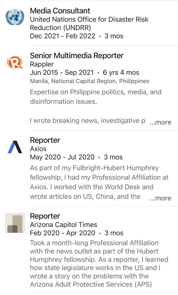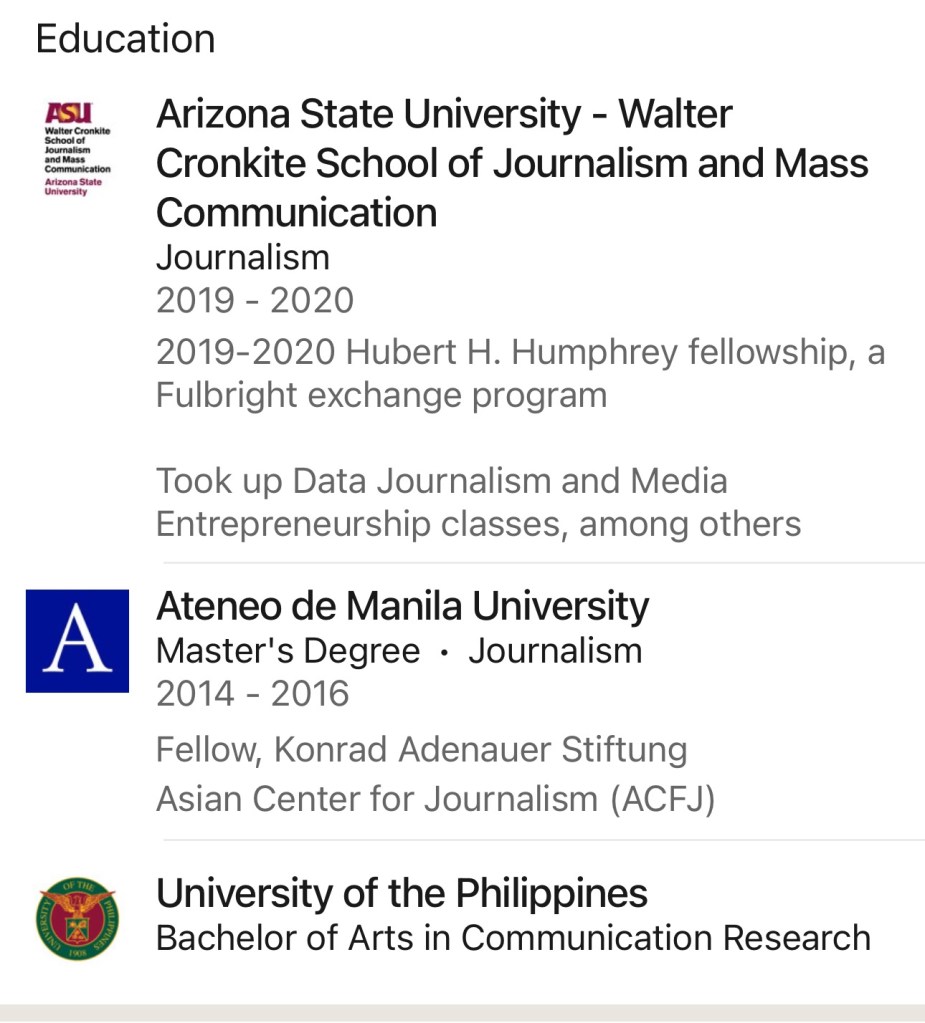 In 2019, she was one of two Filipinos awarded the prestigious Fulbright – Hubert H. Humphrey Fellowship. She spent a year in the US, where she covered President Donald Trump’s immigration policies, the 2020 presidential campaign, and the Filipino community.