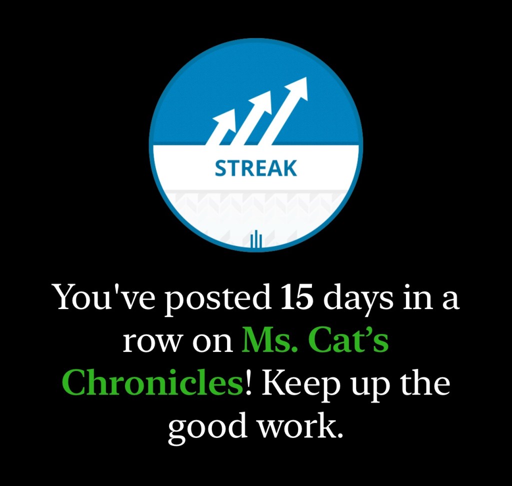 WordPress just notified me that I had been posting for 15 days in a row. I’m surprised I managed to do so. I can’t promise to keep up with that.