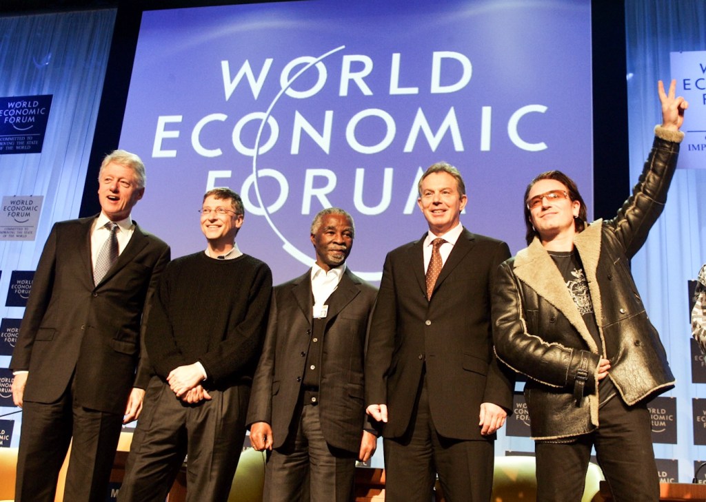 Bono, far right, poses with left to right: Bill Clinton, Bill Gates, Thabo Mbeki, and Tony Blair at the 2005 World Economic Forum in Davos. Michel Euler | AP