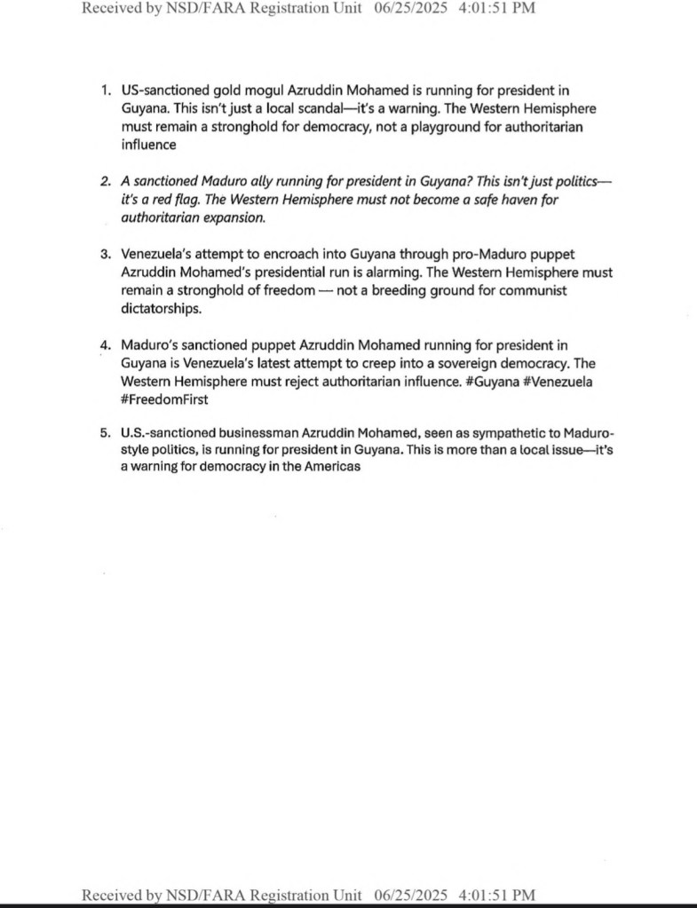 Representative Gimenez’s June 30, 2025, tweet on Guyana–Venezuela relations amplified the specific talking points of Continental Strategy, the registered foreign agent for the Government of Guyana. The firm’s partner, John Barsa—a former USAID administrator during the Trump administration—sent the draft content directly to the Congressman’s office, illustrating a direct translation of foreign policy lobbying into a congressional public statement.