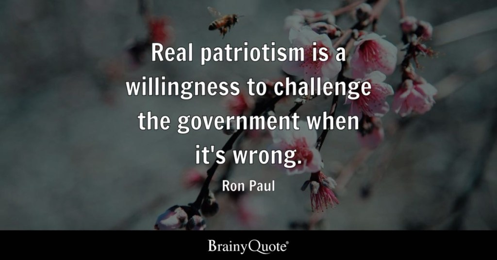 United States Am I Patriotic? February 16, 2026 Tina Marie (Ms. Cat)Leave a comment Are you patriotic? What does being patriotic mean to you? Only if you define patriotism as what Ron Paul said about it. Share this: Share on Facebook (Opens in new window) Facebook Share on X (Opens in new window) X Share on LinkedIn (Opens in new window) LinkedIn Email a link to a friend (Opens in new window) Email Share on Threads (Opens in new window) Threads Share on Mastodon (Opens in new window) Mastodon Share on Bluesky (Opens in new window) Bluesky Like Loading... Related