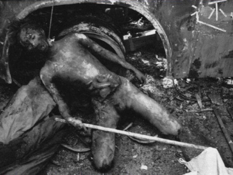 The body of a dead soldier, who was lynched and burned, near the Communist Party headquarters. Beijing, China, June 4, 1989